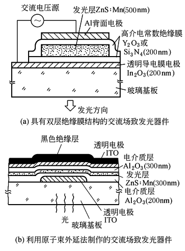 (1)In2O3/Y2O3/ZnS∶Mn/Y2O3/Al五层复合膜层 用在双层绝缘膜结构的高辉度、长寿命器件上(见图a) 该器件是在玻璃基板上蒸镀In2O3透明导电薄膜,其上形成厚约200nm致密的Y2O3高介电性绝缘膜,然后再蒸镀仅含有少量Mn的ZnS荧光体约500nm的薄膜作为发光层,接着在发光层上蒸镀一层厚度尽可能同前一绝缘膜相同的Y2O3膜,最后再蒸镀一层铝金属作为背面电极,制成三明治结构 为了提高绝缘膜与铝金属膜之间的附着性,在它们之间可形成厚约20~500nm的Al2O3膜。近年来,还在背面补加一层玻璃,以便在它与背面电极之间封入少量黑色的硅油,可以充分防止湿气从外面侵入,从而实现3万~5万小时的长寿命和高可靠性 (2)Al2O3/ZnS∶Mn/Al2O3三层复合膜层 同样是双层绝缘膜结构器件,有的则采用原子束外延蒸镀法来制作发光层(ZnS∶Mn)和绝缘层Al2O3,从而使发光效率得到大幅度提高。元件的结构如图b所示。在玻璃基板上用溅射法形成厚约50nm的ITO薄膜,其上用原子束外延生长法制作Al2O3和ZnS∶Mn所形成的绝缘层-发光层-绝缘层的三层夹层结构 (3)Al2O3/NiO/ZrO2/Ni/Al/Al2O3/Cu/LaCoO3七层复合膜层为了满足某功能的需要常要制备多层涂层,例如,一种高温固体电解燃料电池即用了七层,其顺序为:①Al2O3气密层;②NiO燃料电池层;③温度ZrO2层;④Ni/Al电流导出膜层;⑤Al2O3气密保护层;⑥Cu层;⑦LaCoO3空气电极层 |