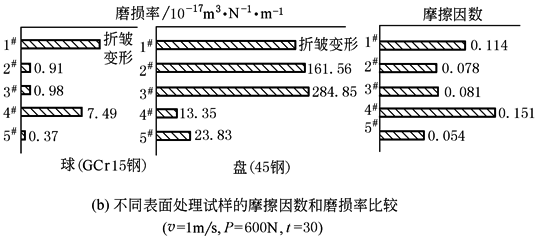 1—860℃水淬和200℃回火,硬度627HV 2—860℃水淬和200℃回火,硬度627HV,刷镀Ni-Cu-P镀层(Ni64%,Cu34%,P2%),硬度961HV 3—860℃水淬和590℃回火,硬度243HV,刷镀Ni-Cu-P镀层,硬度904HV 4—860℃水淬和550℃回火,硬度487HV,离子渗氮,电压370V,电流7.6A,(540~560℃)×13h,硬度478HV 5—860℃水淬和550℃回火,硬度487HV,离子渗氮加刷镀Ni-Cu-P镀层,硬度502HV |