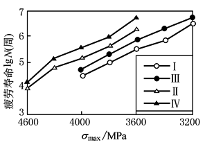 Ⅰ—930℃渗碳,碳势105%,850℃淬油,190℃回火 Ⅱ—930℃渗碳,碳势13%,880℃淬油,190℃回火 Ⅲ—工艺Ⅰ+强力喷丸(HC-34型喷丸机,用直径2.8mm、硬度48~55HRC的钢丸,喷丸强度fa=0.56mm) Ⅳ—工艺Ⅱ+强力喷丸(喷丸条件同Ⅲ) |