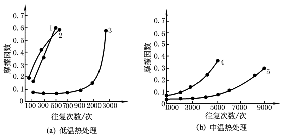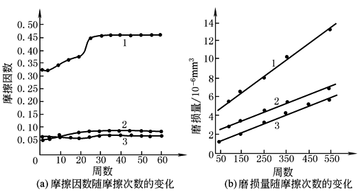 ①GCr15(淬火)钢球,无涂层 ②45钢(淬火)基材盘,电刷镀Pb,厚18.4μm ③45钢(淬火)基材盘,表面电刷镀Pb76.4%-Sn12.6%��Cu11.0%(均为质量分数)镀层,厚20.345μm ④GCr15(淬火)基材钢球,表面CVD法镀(TiC/TiN)7七层镀层,厚度5 ⑤⑥约50min后固体润滑涂层完全磨穿,此后的摩擦因数为0.61 |