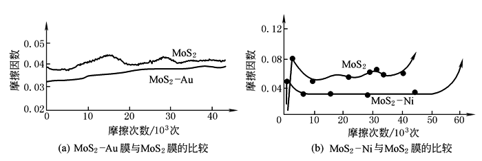 MoS2-Au和MoS2-Ni共溅射膜是采用MoS2-金属共溅射的方法制备复合膜。共溅射膜更致密,摩擦因数稳定,耐磨寿命长。下图是MoS2-Au和MoS2-Ni共溅射膜与MoS2溅射膜摩擦学性能的比较。由图可以看出两种共溅射膜的摩擦学性能都比MoS2溅射膜好(试验采用栓-盘式试验机,负荷5N,滑动速度0.1m/s,大气中干摩擦条件) |