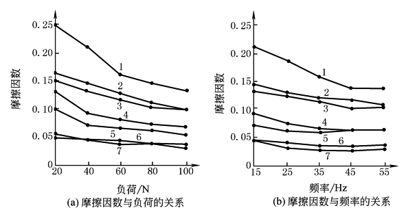 1—52100钢;2—Si3N4;3—TiN;4—IBAD MoSx-Si3N4;5—IBAD MoSx-TiN; 6—MS MoSx-Si3N4;7—MS MoSx-TiN 上试样为f 10mm的Si3N4陶瓷球,下试样为沉积了薄膜的圆盘 试验条件:振幅为1mm,时间为30min,液体石蜡润滑,用15Hz的振动频率测定摩擦因数-负荷关系,用40N的负荷测定摩擦因数-频率关系 |