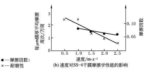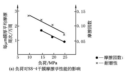 (1)SS-2干膜 在硅酸盐黏结干膜中,以硅酸钾为黏结剂,MoS2和石墨为润滑剂,水作稀释剂的黏结干膜称为SS-2干膜。该膜适于-178~400℃温度范围内工作。在不锈钢上喷涂40~50μm厚的这种干膜,在TimKen试验机上,以负荷315N、速度2.5m/s的条件试验,其摩擦因数为0.06~0.08,平均磨损寿命为120m/μm。在60Co源的射线下累积辐照量达6.8×108R(伦琴)后,7次试验的平均磨损寿命100m/μm。SS-2干膜具有良好的储存稳定性,可以满足液氧输送泵轴承的润滑要求 (2)SS-3干膜 以硅酸钾为黏结剂,MoS2、石墨和银粉为润滑剂,水作稀释剂的黏结干膜称为SS-3干膜。该膜的耐磨性优于SS-2干膜 (3)SS-4干膜 在SS-3干膜基础上通过改进工艺制成的 该膜在TimKen试验机上,以负荷320N、转速1000r/min的条件做试验,测得其摩擦因数为0.09~0.016,平均磨损寿命为206~417m/μm(膜厚20~50μm,室温)。在环-块试验机上的测定表明,它的摩擦因数随负荷和速度的增加而减小,磨损寿命随负荷和速度增加而降低。在CZM型真空试验机上对10~20μm的SS-4干膜进行摩擦学性能测定(真空度133.322×10-6Pa,负荷15MPa,滑动速度10m/s,栓、盘材料均为不锈钢),结果由下图可见,该膜在真空条件下的摩擦因数随负荷和速度的增加而减小,磨损寿命随负荷和速度的增加而降低。由于薄的SS-4干膜的耐磨性较好,所以可以用在滚动轴承和精度要求较高的相对运动部件上 以磷酸盐为黏结剂,石墨、氟化石墨和BN为固体润滑剂,水为稀释剂的黏结干膜是为了在室温到700℃的宽范围内使用而研制的。在650~700℃的温度下,该干膜的摩擦因数很小,但耐磨性很差。将干膜喷剂进行表面活化处理后再进行喷涂可提高干膜的结构强度和耐磨性 对于黏结固体润滑干膜的润滑和失效机理的某些研究得出:一般黏结固体润滑干膜的磨损寿命受速度的影响比负荷的影响更敏感,即润滑膜在重负荷、低速度下的使用寿命长于在同样pv值下低负荷、高速度下的耐磨寿命;部分黏结固体润滑干膜的磨损过程主要是由于摩擦过程中所产生的小气泡的作用,气泡的形成、扩大和破裂是这部分润滑膜的主要失效过程;在摩擦对偶表上可看到转移膜的形成及其性质是影响润滑膜摩擦学性能的重要因素之一,如在摩擦中能迅速在对偶面上形成与基材结合良好的均匀转移膜,则摩擦因数就低而稳定,耐磨寿命长