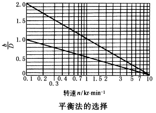 圆柱形转子或厚度与直径之比大于0.2的盘状转子应根据转子的工作转速来决定平衡方式。图表示平衡的应用范围,用转子尺寸比(b——转子厚度,D——转子直径)和每分钟转速n的关系表达。下斜线以下的转子只需进行静平衡,上斜线以上的转子必须进行动平衡,两斜线间的转子须根据转子的质量、制造工艺、加工情况(部分加工还是全部加工)及轴承的距离等因素,来确定是否需要进行动平衡