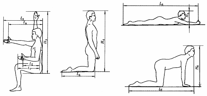 注:跪、俯卧、爬姿数据计算方法见表跪姿、俯卧姿、爬姿人体尺寸的计算。 |