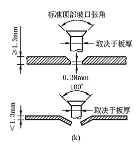 闪光铆接可以用于镁合金的连接,其接头设计形式如图k所示。机械沉头孔孔深至少为1.3mm,底部圆柱形台阶的最小高度为0.38mm,以保证与铆钉尺寸匹配 厚1.3mm左右的材料可以采用上连接板攻螺纹的闪光铆接,螺纹孔和铆钉坡口标准张角为100°。攻螺纹前,应先冲好或钻好铆钉孔,且孔径应略小于铆钉直径;攻螺纹时,扩孔到标准尺寸。倒角圆孔将会减小边缘应力集中和接头疲劳破坏。攻螺纹必须在热态下进行,使板局部加热,其范围刚好达到攻螺纹尺寸。如果板材处于H24状态,加热时间应有所限制,以避免局部淬火。例如,AZ31B-H24板材在423K温度下加热5s不会发生淬火效应 |