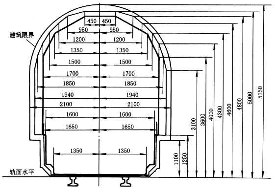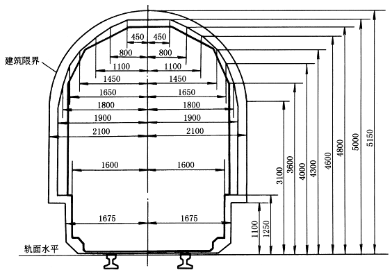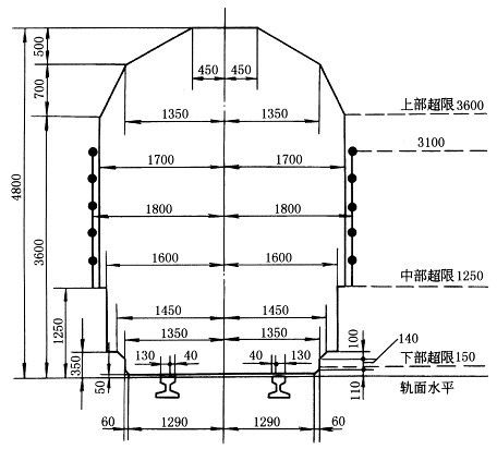 (1)凡经铁路运输的产品,均应符合铁路部门运输的有关规定,确保产品安全地运到用户手中。 (2)包装箱或产品零部件的最大外形尺寸、重量应符合国内外运输方面有关超限超重的规定。设计产品包装时,应尽量不超过机车车辆限界尺寸,见下图机车车辆限界图。如无法解决时,可按一、二级超限的装载限界进行包装,见图一级超限及图二级超限。