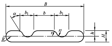 单面双槽弹簧扁钢截面 R≈1/2H;r=2~3mm;图中列出的R、r、b、b1、α 只在孔型上控制,不作为验收条件 |