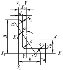 | B—长边宽度;b—短边宽度;d—边厚度;I—惯性矩; i—惯性半径;W—截面系数;r—内圆弧半径; X0—质心距离; r1—边端内圆弧半径r1=1/3d;Y0—质心距离 | ||||||||||||||||||||