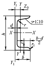 | h—高度 r1—腿端圆弧半径 b—腿宽度 I—惯性矩 d—腰厚度 W—截面系数 t—平均腿厚度 i—惯性半径 r—内圆弧半径 Z0—Y-Y 与Y1-Y1 轴线间距离 |