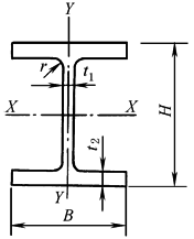 H———高度 B———宽度 t1———腹板厚度 标记:H后加高度×宽度×腹板厚度×翼缘厚度 t2———翼缘厚度 例如:H800×300×14×26 r———圆角半径 |