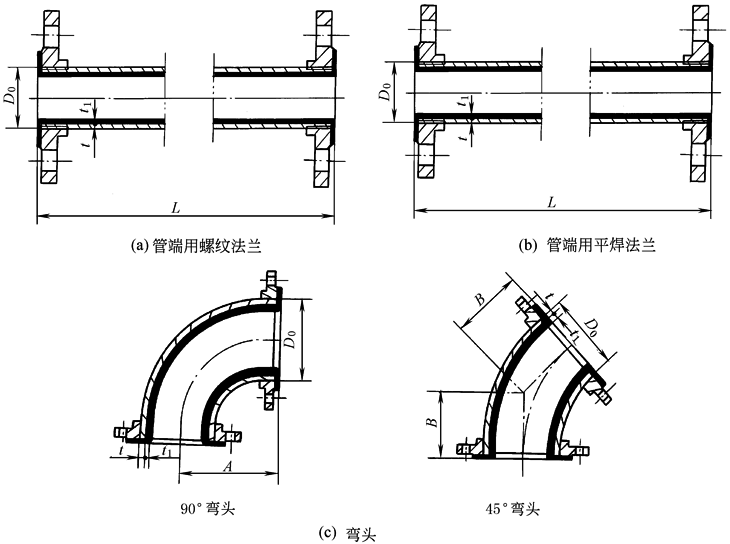 1.涂塑钢管和管件的结构尺寸、压力等级和检验要求与衬塑钢管和管件相同 2.钢管采用HG 20533《化工配管用无缝及焊接钢管尺寸选用系列》中Ⅰ系列 3.衬塑铸钢管件详细规格见HG/T 20538—1992 4.衬塑钢制三通、异径管尺寸与衬聚四氟乙烯三通、异径管相同,详见表衬聚四氟乙烯三通和异径管,但两端法兰连接都是平焊法兰,超过表中所列的大规格尺寸见HG/T 20538—1992 |
