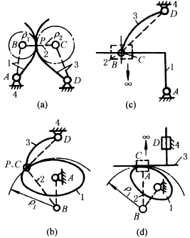 由于一个平面运动高副有一个约束条件,而一个具有二个平面运动低副的构件也具有一个约束条件,因而可将高副机构用瞬时运动特性相当的低副机构来代替,然后按表矢量图解法或解析法来分析。代换的方法如下: (1)求出高副接触处P点的两个曲率中心B、C 和两个曲率半径ρ1、ρ2,ρ1=BP,ρ2=CP(右图a) (2)以杆长为LBC=ρ1+ρ2的杆用两个回转副在B、C 处与杆1、3相拼接,得到低副机构ABCD。当ρ2(或ρ1)为无穷大时,则一个回转副变为移动副(右图c、d);当ρ2(或ρ1)为零,则一个回转副即在高副接触处(右图b)。由于一般高副机构中高副接触处的曲率半径是随机构位置的变化而变化的,所以在不同瞬时的相当低副机构的构件尺寸是不同的,应予注意 |
