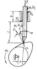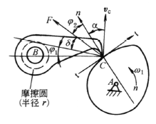 φ1为从动件与轴B之间的摩擦角,设摩擦圆半径为r,则 φ1=arcsin(r/BC)≈arctan(4μ/π) αc与两处摩擦角有关 |
