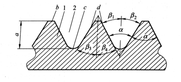 | 由不平行于螺纹中径线的原始三角线一个边所形成的螺旋表面 1—牙体 2—牙槽 a—牙高 b—牙顶 c—牙底 d—牙侧 | |