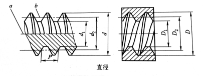 | 与外螺纹牙顶或内螺纹牙底的假想圆柱或圆锥的直径 注:1.对圆锥螺纹,不同螺纹轴线位置处的大径是不同的 2. 当内螺纹设计牙型上的大径尺寸不同于其基本牙型上的大径时,设计牙型上的大径使用代号D4 a—螺纹轴线 b—中径线 | |