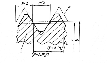| 一个假象圆柱或圆锥的直径,该圆柱或圆锥的母线通过实际螺纹上牙槽宽度等于半个基本螺距的地方。通常采用最佳量针或量球进行测量 注:1.对圆锥螺纹,不同螺纹轴线位置处的单一中径是不同的 3. 对理想螺纹,其中径等于单一中径 1—带有螺距偏差的实际螺纹 a—理想螺纹 b—单一中径 c—中径 | |