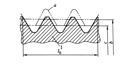 | 在规定的旋合长度内,恰好包容(没有过盈或间隙)实际螺纹牙侧的一个假想理想螺纹的中径。该理想螺纹具有基本牙型,并且包容时与实际螺纹在牙顶和牙底处不发生干涉 注:对圆锥螺纹,不同螺纹轴线位置处的作用中径是不同的 1—实际螺纹 lE—螺纹旋合长度 a—理想内螺纹 b—作用中径 c—中径 | |