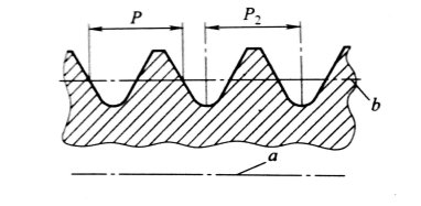 | 螺距P:相邻两牙体上的对应牙侧与中径线相交两点间的轴向距离牙槽 螺距P2:相邻两牙槽的对称线在中径线上对应两点间的轴向距离。通常采用最佳量针或量球进行测量 注:牙槽螺距仅适用于对称螺纹,其牙槽对称线垂直于螺纹轴线 累计螺距PƩ:相距两个或两个以上螺距的两个牙体间的各个螺距之和 a—螺纹轴线 b—中径线 | |