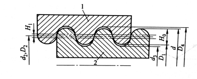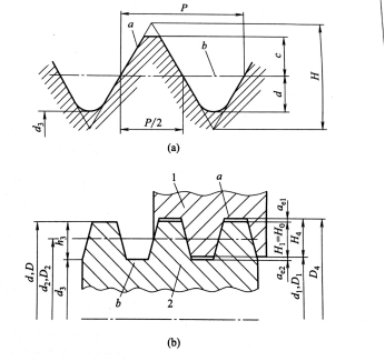 | 在基本牙型基础上,具有圆弧或平直形状牙顶和牙底的螺纹牙型 注:设计牙型是内、外螺纹极限偏差的起始点 图(a) a—设计牙型 b—中径线 c—牙顶高 d—牙底高 图(b) 1—内螺纹 2—外螺纹 a—内螺纹设计牙型 b—外螺纹设计牙型 | |