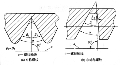 | 对称螺纹:相邻牙侧角相等 非对称螺纹:相邻牙侧角不 相等 | |