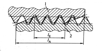 | 螺纹旋合长度lE:两个配合螺纹的有效螺纹相互接触的轴向长度 螺纹装配长度IA:两个配合螺纹旋合的轴向长度。 注螺纹装配长度允许包含引导螺纹的倒角和(或)螺纹收尾 1—内螺纹 2—外螺纹 | |