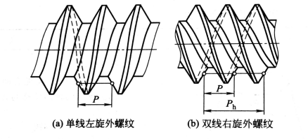 | 单线螺纹:只有一个起始点的螺纹,其螺距等于导程 多线螺纹:具有两个或两个以上起始点的螺纹,其螺距等于导程除以线数 P—螺距 Ph-导程 | |
