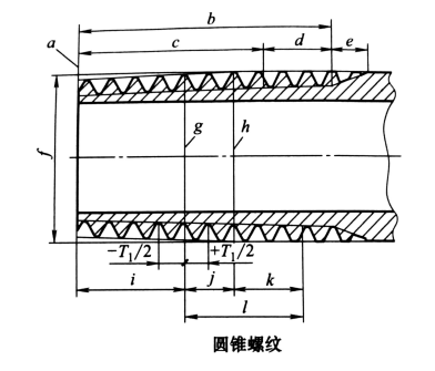 | 牙顶和牙底均具有完整形状的螺纹 注:当引导螺纹的倒角轴向长度不超过一个螺距,此引导螺纹包含在完整螺纹长度之内 a—参照平面 b—有效螺纹 c—完整螺纹 d—不完整螺纹 e—螺纹收尾 f—基准直径(d) g—基准平面 h—手旋合时最小实体内螺纹工件端面能够到达的轴向位置 i—基准距离 j—与内螺纹正公差相等的余量 k—扳紧余量 l—装配余量 序号62~73是与密封管螺纹相关的术语 | |