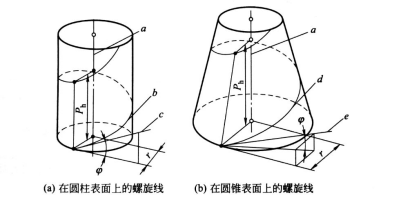 | 沿着圆柱或圆锥表面运动的点轨迹,该点的轴向位移和相应的角位移成定比 a—螺旋线轴线 b—圆柱形螺旋线 c—圆柱形螺旋线的切线 d—圆锥形螺旋线 e—圆锥形螺旋线的切线 Ph—螺旋线导程