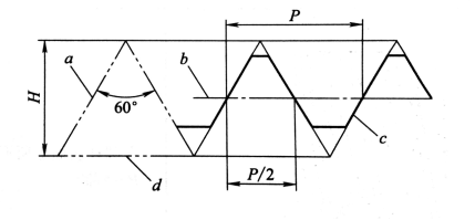 | 原始三角形:由延长基本牙型的牙侧获得的三个连续交点所形成的三角形 基本牙型:在螺纹轴线平面内,由理论尺寸、角度和削平高度所形成的内外螺纹共有的理论牙型。它是确定螺纹设计牙型的基础 a—原始三角形 b—中径线 c—基本牙型 d—底边 | |