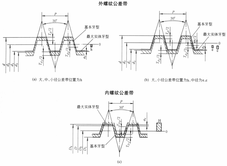 注:1.公差带的位置由基本偏差确定,本标准规定外螺纹的上偏差 es 及内螺纹的下偏差 EI 为基本偏差。 2.对外径的中径 d2 规定了三种公差带位置 h(图a)、e和c(图b);对大径 d 和小径d3,只规定了一种公差带位置h,h 的基本偏差为零,e 和c的基本偏差为负值。对内螺纹的大径 D4 、中径 D2 及小径 D1 规定了一种公差位置H(图c),其基本偏差为零。 |