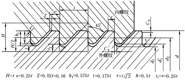 水系统45°锯齿形螺纹基本尺寸(JB/T 2001.73—1999) mm |