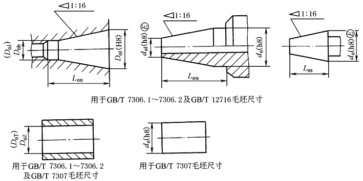 注:1.本标准适用于切制管螺纹或圆锥管螺纹前的毛坯尺寸。 2.引用标准:GB/T 7306.1~7306.2《55°密封管螺纹》;GB/T 7307《非螺纹密封的管螺纹》;GB/T 12716《60°圆锥管螺纹》。 3.当内螺纹底径由车(镗)削制出时,其公差代号规定为H10。 4.本标准中各项尺寸均不包括螺纹倒角。 |