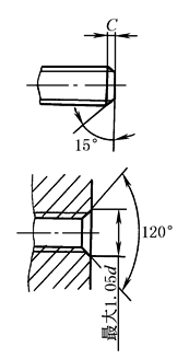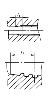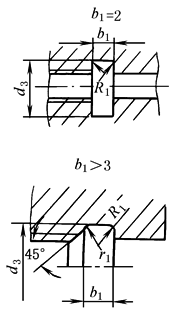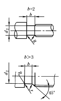 注:1.外螺纹的螺尾角α=25°的螺尾数值系列为基本的。内螺纹的螺尾角不予规定,依螺尾长度l1与螺纹牙型高度来确定。 2.对辗制和铣制的螺尾角不予规定,而螺尾长度l不超过表中对α=25°时所规定的数值。 3.螺纹倒角的宽度是指在切制螺纹前的数值。 4.在必要的情况下,b(或b1)的退刀槽宽度两种型式可以采用本表规定以外的退刀槽宽度,但不得小于1.2倍螺距和不大于3倍螺距。 5.在结构有特殊要求时,允许不按本表规定的退刀槽直径d2与d3。 |