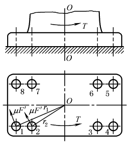 用普通螺栓组连接承受旋转力矩T,其工作原理是靠拧紧螺栓后,靠接合面间的摩擦力矩来平衡旋转力矩T。在此假设各螺栓所受的预紧力相等,即在接合面产生的摩擦力相等,并集中在螺栓中心处,其方向与螺栓中心至底板旋转中心的连线垂直,每个螺栓预紧后在接合面间产生的摩擦力矩之和必与旋转力矩T相平衡。各螺栓所受预紧力相等,为