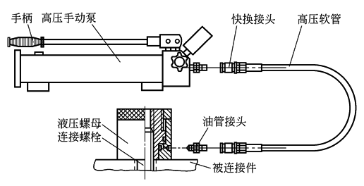 液压防松螺母及拉紧器借助于高压(pmax=250MPa)油泵产生的高压油,使螺杆轴向伸长,利用螺杆的弹性变形将螺纹连接锁紧。可以精确地达到设计要求的预紧力,其预紧力比转矩预紧者提高30%以上。采用附件后可实现多个螺栓同步预紧,使被紧固件均匀受力 液压防松螺母与液压螺栓拉紧器分别是用于高预紧力、大规格螺纹连接的紧固件和装拆工具,适用于振动工况下大、重型机械设备和狭窄空间设备的紧固连接。具有优良的防松效果,连接可靠、装拆方便、节时省力等特点,兼有野外防盗功能。已较广泛地用于矿山、电力、石化、铁路、交通、建筑等行业,该产品尚无国家及行业标准。液压防松螺母及拉紧器的加压系统主要由高压手动泵、快换接头、高压软管、油管接头、液压螺母组成,如图所示