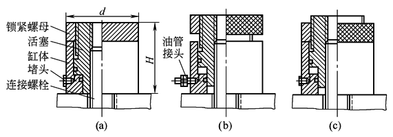图1 液压防松螺母加压系统示意 (1)液压防松螺母的结构、装拆及产品规格性能 液压防松螺母由缸体,具有内、外螺纹和密封圈的活塞和锁紧螺母组成。其操作程序为:将液压防松螺母整体拧到连接螺栓上,直至消除各连接件之间的间隙(图2a);卸去堵头,将排净空气后的高压手动油泵、软管接头接到缸体的油管接头上,往复扳动高压油泵的手柄,对油缸加压,使活塞上升,连接螺栓伸长,锁紧螺母、活塞与缸体之间产生间隙,活塞内螺纹与螺栓间形成了强大的预紧力(图2b);将锁紧螺母拧到与缸体上端面接触并拧紧,卸压,拆除加压系统,拧上堵头,连接被紧锁(图2c)。拆卸液压防松螺母的过程与安装过程相仿,接装加压系统,加压,活塞带着锁紧螺母上升,当螺母底面与缸体上端面分离后,将锁紧螺母上端面拧至与活塞上端面平齐(图2b),卸压,拆除加压系统,轻微敲击并旋转活塞及螺栓,即可卸下液压防松螺母