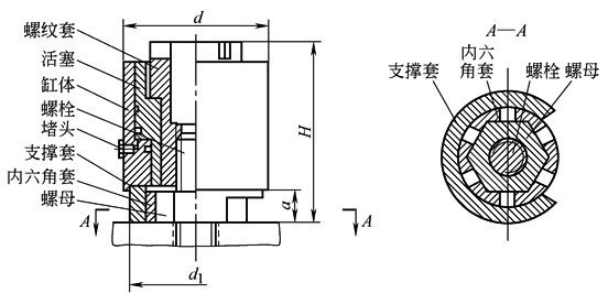 图3 FYL型液压螺栓拉紧器结构示意 其预紧及拆卸过程如下:先将螺母拧紧在螺栓上,再将内六角套套在螺母外面,放好支撑套,将拉紧器组件置于支撑套上,将螺纹套拧在螺栓上;装好加压系统,加压,推动活塞带着螺纹套上升,螺栓伸长带着螺母上升与连接件脱离接触,当达到所需的预紧力或最大拉伸长度时,停止加压;通过内六角套的径向孔将螺母拧紧,卸压,拆除拉紧器,螺母便将螺纹连接锁紧。拆卸螺母时,步骤同上,当螺母与被紧固件脱离接触后,停压,通过内六角套上的径向孔将螺母拧松若干圈,卸压,拆除拉紧器,即可轻松卸下螺母 |