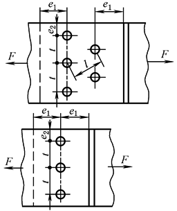 注:1.d0为铆钉孔直径;δ为较薄板的厚度。 2.钢板边缘与刚性构件(如角钢、槽钢等)相连的铆钉的最大间距,可按中间排确定。 3.有色金属或异种材料(如石棉制动带与铸铁制动瓦)铆接时,铆缝的结构参数推荐:铆钉直径d=1.5δ+2mm;间距t=(2.5~3)d;边距e1≥d,e2≥(1.8~2)d。 |