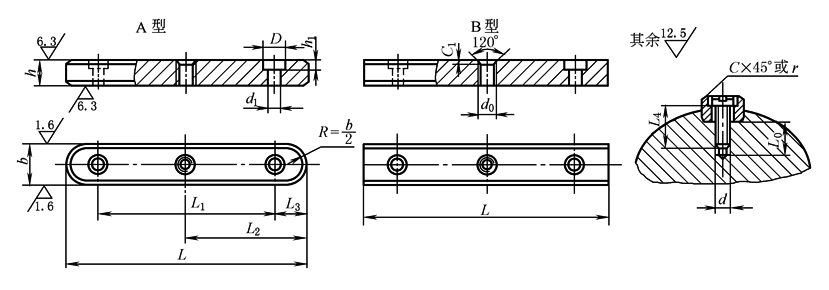 标记示例: 宽度 b=16mm、高度h=10mm、长度L=100mm、导向A型平键,标记为:GB/T 1097 键 16×100 宽度 b=16mm、高度h=10mm、长度L=100mm、导向B型平键,标记为:GB/T 1097 键 B16×100 |