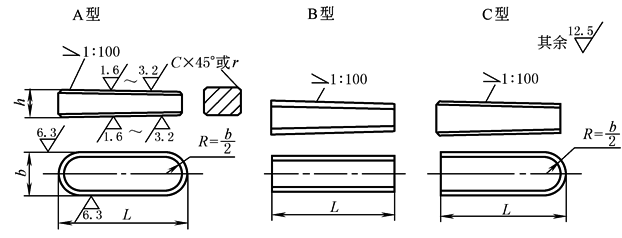 标记示例 宽度b=16mm、高度h=10mm、长度L=100mm、普通A型楔键,标记为:GB/T 1564 键16×100 宽度b=16mm、高度h=10mm、长度L=100mm、普通B型楔键,标记为:GB/T 1564 键B16×100 宽度b=16mm、高度h=10mm、长度L=100mm、普通C型楔键,标记为:GB/T 1564 键C16×100 |