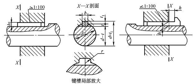注:1.(d+t1)及t1表示大端轮毂槽深度。 2.安装时,楔键的上工作面与轮毂槽的底面必须紧密贴合。 3.楔键的上工作面表面粗糙度参数Ra值推荐为3.2μm。 4.(d-t)和(d+t1)两个组合尺寸的极限偏差按相应的t和t1的极限偏差选取,但(d-t)的极限偏差值应取负号。 |