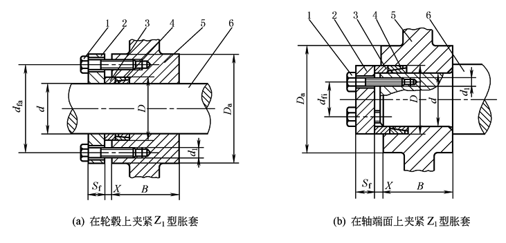 Z1型胀套需以法兰和螺栓夹紧,有在轮毂上或在轴端面上夹紧两种型式(下图),按需要选择