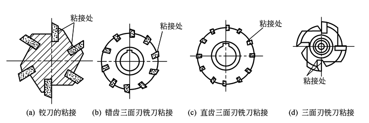 (1)刀架和硬质合金刀刃用丙酮或汽油清洗后,再用盐酸等溶液处理干净并烘干 (2)常用无机胶或环氧胶。无机胶配方:磷酸溶液1份,氧化铜粉3.5~4.5份。环氧胶配方:618#环氧树脂100份;聚硫橡胶20份;704固化剂10份;铁粉100~200份 (3)粘接后在60~70℃加热2~4h |