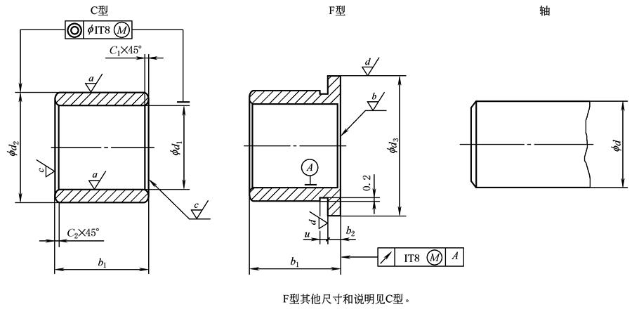 注:1.括号内的值仅作特殊用途,应尽可能避免使用。�� 2.F型图见表1的表头图。�� 3.F型翻边轴套是否带退刀槽(尺寸u)应根据供需双方协议而定。 |