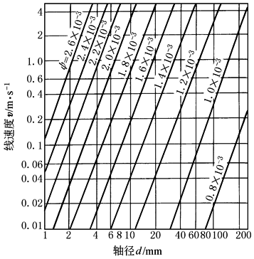 根据轴径和速度可从右图中选取相对间隙 ψ。间隙过大,在不平衡载荷的作用下,运转时会产生过大噪声;间隙过小,摩擦力矩增大,温度升高