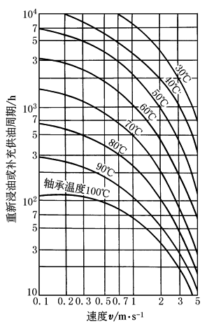 1.新旧轴承均可按此表选用润滑油进行真空浸渍或热油浸渍。热油浸渍一般是将油加热到70~150℃,将轴承放入,并随油冷却到室温 2.重新浸油时间:因油损耗和变质情况,建议每工作1000h后或每年重新浸一次油。较准确的重新浸油时间,可参考上图按速度与温度关系查出 |