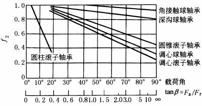 轴承的极限转速与轴承的类型、尺寸、载荷、润滑、精度、游隙、保持架及冷却条件等因素有关,但最主要的因素是轴承的允许工作温度。列于轴承尺寸与性能表中的各个型号轴承极限转速,分别是在脂润滑和油润滑条件下确定的。它仅适用于:① P≤0.1C的载荷条件;② 润滑冷却条件正常;③ 刚性的轴承座和轴;④ 向心轴承仅承受径向载荷,推力轴承仅承受轴向载荷;⑤ 轴承公差为0级 当轴承在P>0.1C载荷条件下运转时,滚动体和滚道接触面的接触应力增大,使轴承温度升高,润滑剂的性能相对恶化。因此,应将性能表中极限转速的数值乘以降低系数f1,见图(a) 对于承受径向和轴向联合载荷作用的向心轴承,由于承受载荷的滚动体的数量增加,摩擦与发热增大,润滑条件变差,因此,必须根据轴承类型和载荷角大小,将性能表上的极限转速乘以一个降低系数f2,见图(b) |
