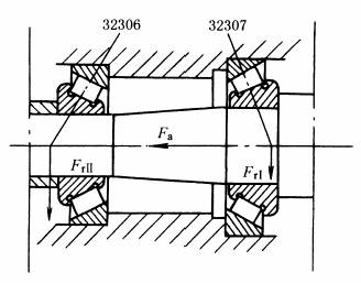 已知条件:某传动机构由两个单列圆锥滚子轴承支承,如上图所示,轴承Ⅰ选用32307型轴承,轴承Ⅱ选用32306型轴承,轴承转速n=1380r/min,两轴承受力FrⅠ=4000N、FrⅡ=4250N,外加轴向力Fa=350N,方向如图。计算两轴承寿命 解:查表单列圆锥滚子轴承得:CrⅠ=99000N eⅠ=0.31 YⅠ=1.9 Y0Ⅰ=1.1 CrⅡ=81500N eⅡ=0.31 YⅡ=1.9 Y0Ⅱ=1.1