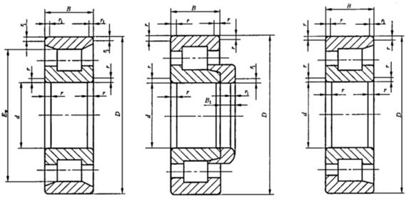N型 NH型(NJ+HJ) NF型 符号含义与应用 N—外圈无挡边 NF—外圈有单挡边 NH—内圈有单挡边(NJ)并带斜挡圈(HJ) 应用基本同前。N型不能承受轴向载荷,不能限制轴或外壳的轴向位移,常用作游动支承。NF型在有挡边一侧能承受较小轴向载荷,并能限制单向轴向位移,常成对使用。NH型能承受较小的双向轴向载荷,并能限制双向轴向位移。 |